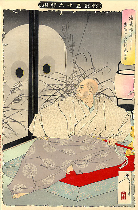 また、「清玄の霊桜姫を慕ふの図」では怨霊を襖の染みのように描いたり、「清盛福原に数百の人頭を見るの図」では、襖の取っ手と月が重なり髑髏に見える工夫がされています。