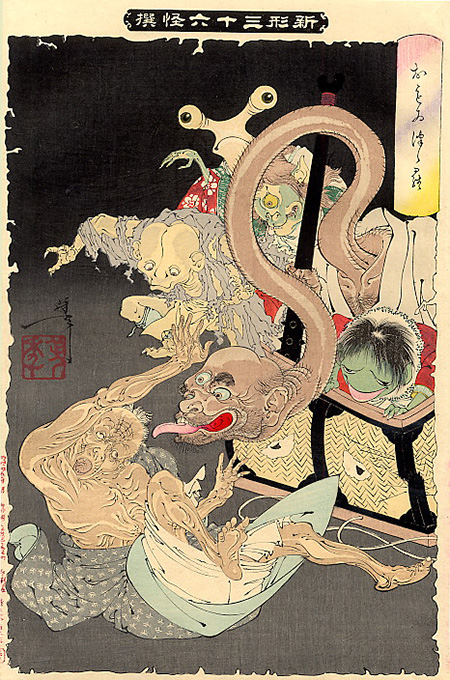 また、虫食い状の枠も妖怪画としての独特な演出で、芳年が神経症に悩んでいたとされる幻覚を反映しているとも言われています。