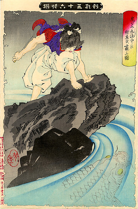 鬼若丸池中に鯉魚を窺ふ図